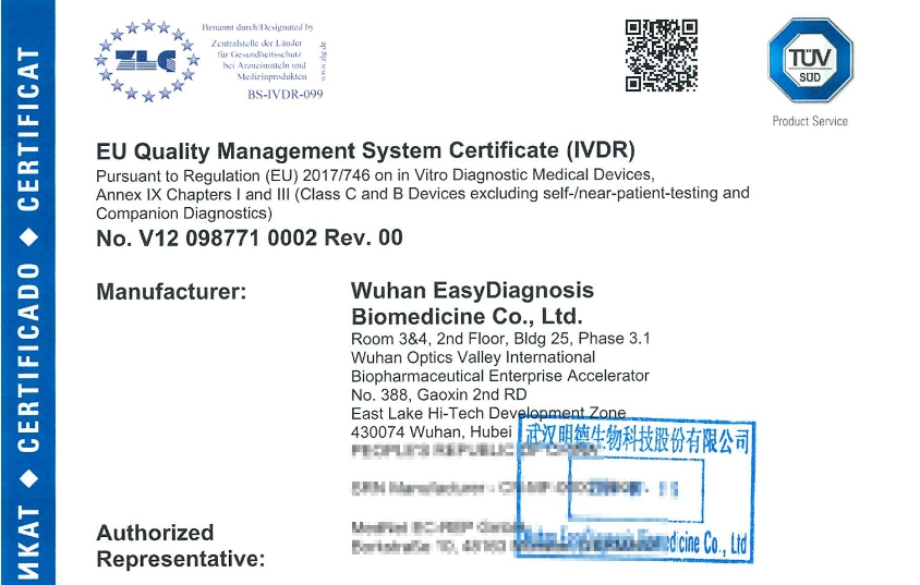 該證書的獲得,是對明德生物在此類疾病檢測及免疫熒光領(lǐng)域的階段性研究成果的極大肯定,也是企業(yè)在產(chǎn)品性能及國際化質(zhì)量體系升級的重要成果,標(biāo)志著明德生物免疫熒光系列產(chǎn)品及質(zhì)量體系已全面滿足歐盟最新最難法規(guī)要求,對明德生物在歐盟地區(qū)的業(yè)務(wù)推廣產(chǎn)生積極的影響。
