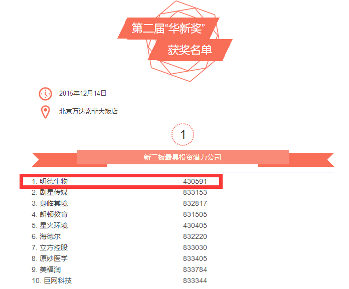 2015年12月14日,2015第一財經(jīng)新三板峰會暨第二屆“華新獎”頒獎盛典在北京召開,武漢明德生物科技股份有限公司入選新三板潛力投資公司榜單。