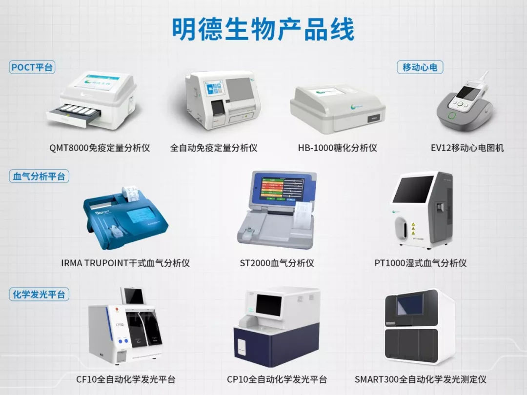 明德生物依托研發(fā)優(yōu)勢和專業(yè)化服務(wù),形成了覆蓋六大領(lǐng)域20余類疾病檢測的產(chǎn)品線,在感染性疾病診斷、心腦血管疾病診斷等領(lǐng)域占據(jù)了優(yōu)勢位置,享有良好口碑。公司研制的檢測產(chǎn)品已經(jīng)進(jìn)入全國3000多家醫(yī)療機(jī)構(gòu)。明德注重產(chǎn)品研發(fā)和技術(shù)創(chuàng)新,目前已經(jīng)陸續(xù)上市了糖化、化學(xué)發(fā)光、血?dú)夥治、分子診斷、胸痛中心、心電網(wǎng)絡(luò)等多項(xiàng)產(chǎn)品和服務(wù)。