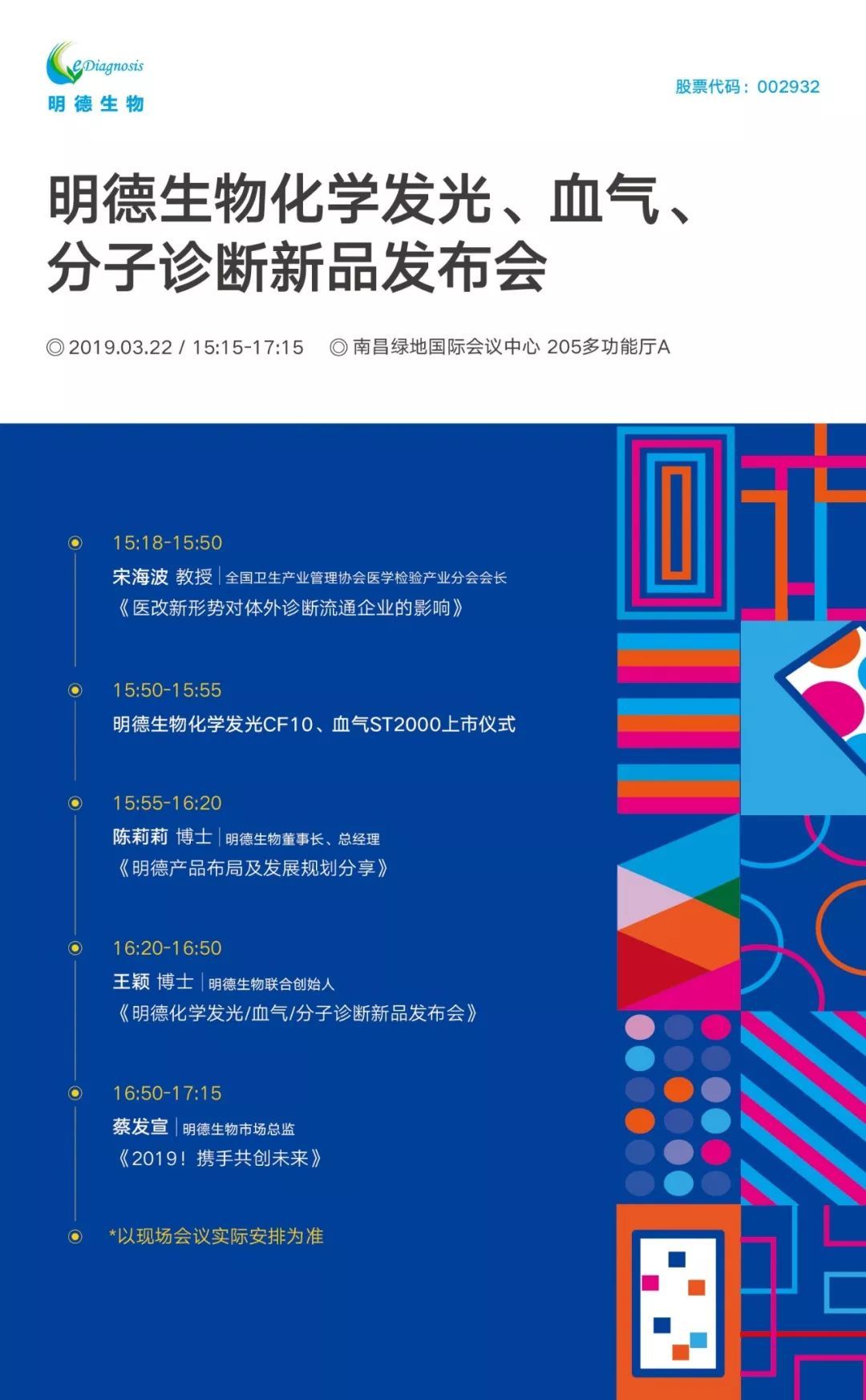 更值得期待的是,3月22日下午15:15-17:15,明德生物將在南昌國(guó)際博覽城綠地鉑瑞酒店會(huì)議中心 205多功能廳A舉行新產(chǎn)品發(fā)布會(huì),發(fā)布POCT化學(xué)發(fā)光、血?dú)夥治觥⒎肿釉\斷等多款新品。