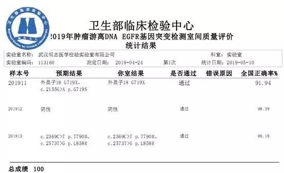 明德生物控股子公司武漢明志醫(yī)學(xué)檢驗實驗室有限公司參加衛(wèi)生部臨檢中心EGFR、腫瘤游離DNAEGFR、ALK、KRAS、氯吡格雷藥物代謝基因(CYP2C19)、人乳頭瘤病毒(HPV)分型共6個項目第一次室間質(zhì)量評價結(jié)果全部滿分通過,再次驗證了明志醫(yī)學(xué)檢驗室實驗的檢測流程規(guī)范,判讀準(zhǔn)確。
