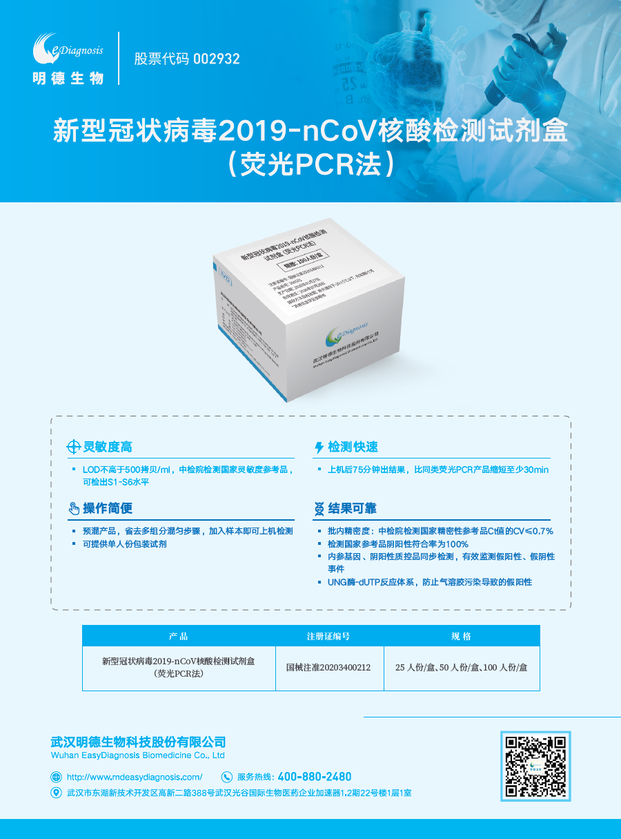 武漢明德生物科技股份有限公司(002932.SZ)成立于2008年,坐落于國家生物產(chǎn)業(yè)基地——武漢光谷生物城。是一家專業(yè)提供體外診斷試劑及配套儀器(POCT\分子診斷\化學發(fā)光\血氣分析等)產(chǎn)品以及胸痛中心、卒中中心、心電網(wǎng)絡等醫(yī)療服務的國家高新技術企業(yè),湖北省企業(yè)技術中心,武漢市企業(yè)研究開發(fā)中心。國內(nèi)高通量POCT倡導者,胸痛中心、卒中中心及遠程心電網(wǎng)絡建設者。目前主營業(yè)務已覆蓋全國30個省、直轄市、自治區(qū)近4000家醫(yī)療機構,同時在亞洲、歐盟、南美等多個區(qū)域?qū)崿F(xiàn)銷售布局。公司于2018年7月10日在深交所掛牌上市,股票代碼002932。
