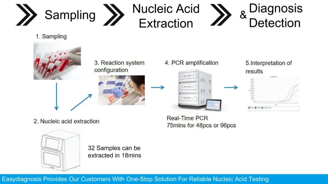 同時(shí),明德生物為海內(nèi)外客戶提供了從樣本采集、核酸提取到新型冠狀病毒核酸檢測的一站式解決方案,具體如下: