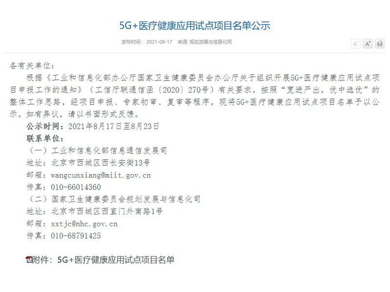 為進一步豐富5G技術(shù)在醫(yī)療健康行業(yè)的應(yīng)用場景,遴選一批技術(shù)先進、性能優(yōu)越、效果明顯的5G+醫(yī)療健康標(biāo)志性應(yīng)用,借此打造行業(yè)標(biāo)桿,國家工信部、國家衛(wèi)健委于2020年底發(fā)布《關(guān)于組織開展5G+醫(yī)療健康應(yīng)用試點項目申報工作的通知》,通過建設(shè)試點項目,開展智慧醫(yī)療健康設(shè)備和應(yīng)用創(chuàng)新,培育可復(fù)制、可推廣的 5G 智慧醫(yī)療健康新產(chǎn)品、新業(yè)態(tài)、新模式。