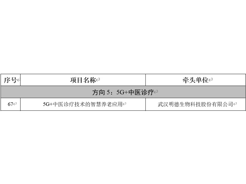 近日,國家工信部、國家衛(wèi)健委聯(lián)合公示了“5G+醫(yī)療健康應(yīng)用試點項目”名單,明德生物牽頭申報的“5G+中醫(yī)診療技術(shù)的智慧養(yǎng)老應(yīng)用”和參與申報的“5G+新型應(yīng)急救治裝備技術(shù)體系”兩大項目均成功入選。