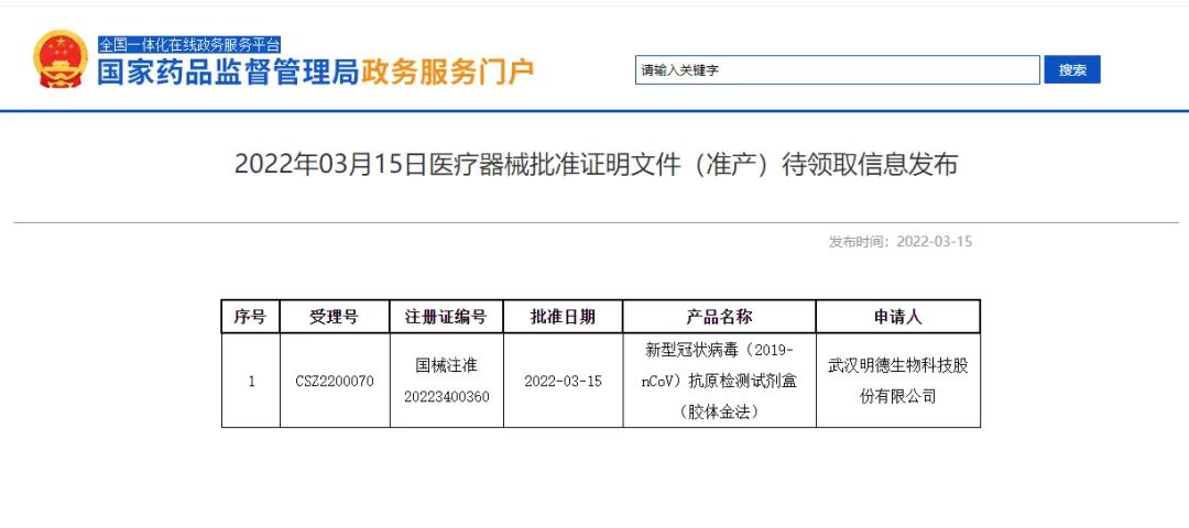 3月15日晚,武漢明德生物科技股份有限公司研制的新型冠狀病毒(2019-nCoV)抗原檢測試劑盒(膠體金法)產(chǎn)品獲國家藥監(jiān)局批準(zhǔn)上市,這也是湖北省首家擁有自主知識產(chǎn)權(quán)的新冠抗原自測產(chǎn)品。